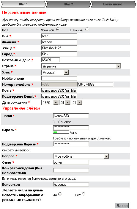 Пройдите по ссылке и начните заполнять регистрационную форму покер-рума Go Play Poker . Следуя нашему образцу, не забудьте проверить наличие бонусного кода hobonus , который позволит Вам выбрать оптимальное бонусное предложение покер-рума ( страница с описаниями бонусов находится здесь ):